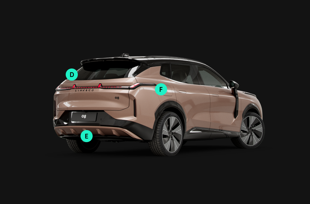 ¹Lynk & Co 08 Plug-in Hybrid, 102 kW (137 PS) + 155 kW (208 PS): Energieverbrauch 21,6 kWh, elektrische Reichweite bis zu 200 km, CO2-Klasse B. Kraftstoffverbrauch komb. 0,94 l/100 km, CO2-Emission 23 g/km. Bei Fahrt mit leerer Batterie Kraftstoffverbrauch komb. 6,5 l/100 km, CO2-Emission 149 g/km, CO2-Klasse E, Energiekosten bei 15.000km Jahresfahrleistung: 1108,26 EUR/Jahr, Mögliche CO2-Kosten über die nächsten 10 Jahre (15.000 km/Jahr): 438,00 EUR